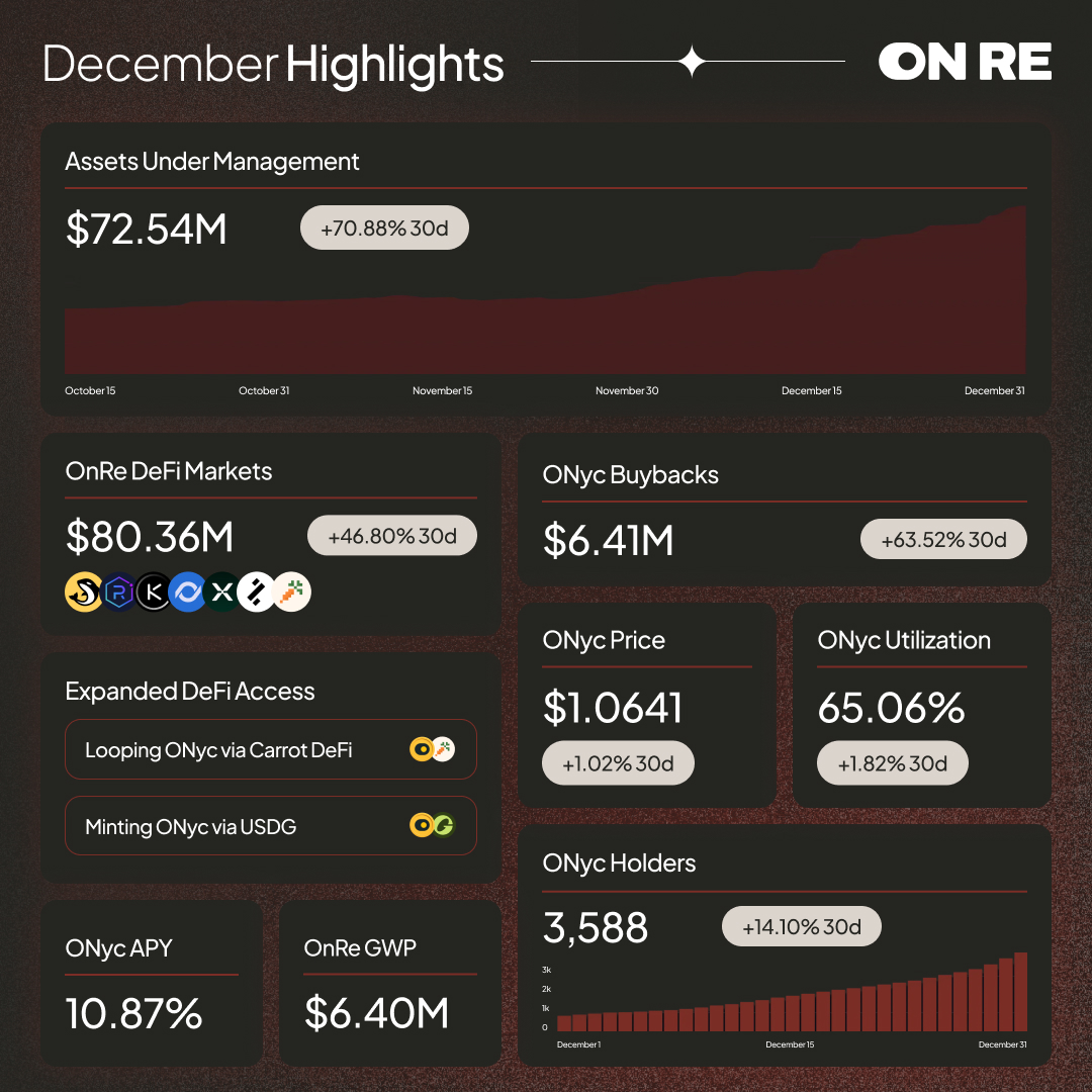 OnRe ended the month with $72.54M in Assets Under Management, up 70.88% over the last 30 days, as more capital moved into ONyc as a yield-bearing stable asset built for DeFi.